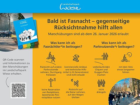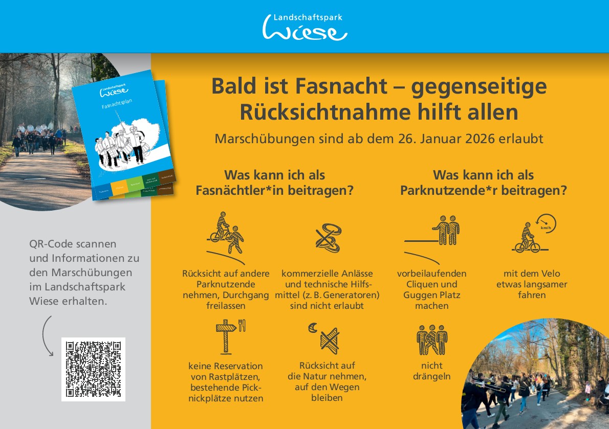 Die Fasnacht 2026 steht vor der Tür. Gemäss der Verordnung zum Waldgesetz sind Marschübungen in den Langen Erlen ab dem 26. Januar zugelassen (§16). Vielleicht haben Sie die aufgestellten Schilder im Park bereits bemerkt. Wir weisen auf diesen darauf hin, dass es von allen Seiten etwas Rücksicht und Verständnis braucht. Danke, dass Sie sich in den kommenden vier Wochen an die abgebildeten Regeln halten. Weitere Informationen zu den Marschübungen in den Langen Erlen finden Sie im Fasnachtsplan Landschaftspark Wiese.