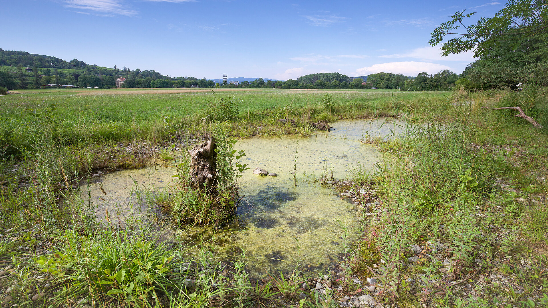 La réserve naturelle du Eisweiher (l’étang de glace en français) est située au cœur de l'ancienne plaine alluviale de la Wiese, au sein du périmètre de protection de l'eau potable du Parc paysager de la Wiese. À cet endroit, le sous-sol se compose princi-palement d'un mélange graveleux et sableux avec un terrain pauvre et sec héber-geant une grande variété d’espèces. Les étangs situés à l’est et à l’ouest du cours d’eau Neuer Teich forment le cœur de la réserve. La zone de protection de la nature du Eisweiher a été amplement étudiée et inventoriée depuis de plusieurs décennies. Elle abrite une multitude d'espèces animales et végétales, dont des amphibiens, des reptiles, des libellules, des papillons diurnes et des mollusques. La diversité d’espèces de batraciens est particulièrement remarquable, y compris des espèces for-tement menacées comme le triton crêté, la rainette verte et le sonneur à ventre jaune. Dans l’ensemble de la réserve, une cinquantaine d'étangs et de mares ont été amé-nagés pour les amphibiens. Le Neuer Teich, originellement un bras de la Wiese, et le Alter Teich concourent également à la diversité écologique de la zone. Ils abritent de nombreuses espèces de poissons et quantité d’autres petits animaux aquatiques. Les surfaces agricoles situées à proximité des étangs sont exploitées de manière ex-tensive pour ne pas perturber la production d'eau potable, ce qui protège également les zones de frai des batraciens. Les prairies et les surfaces boisées fournissent, quant à elles, un habitat terrestre essentiel à leur survie.